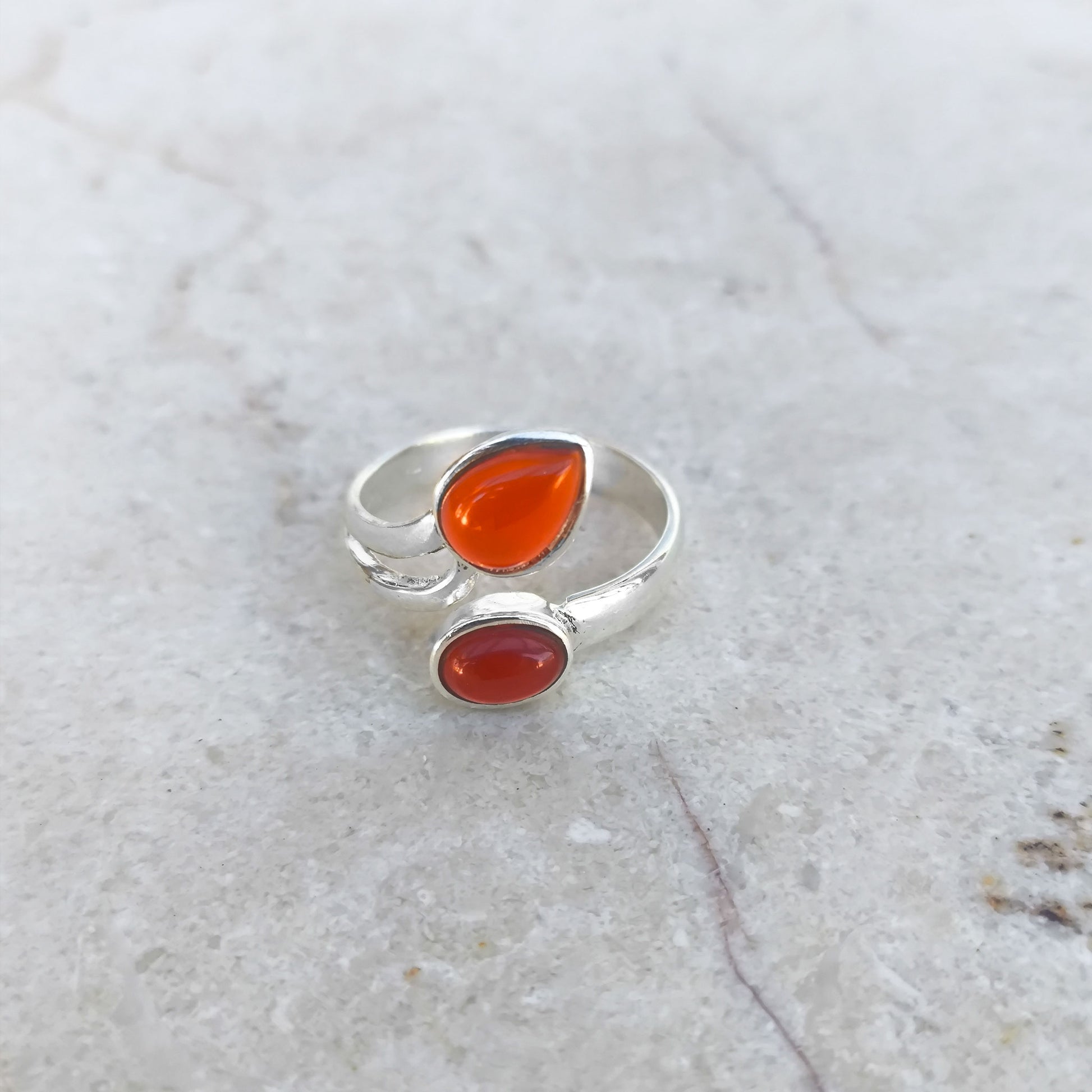 Anillo ajustable de plata de ley 925 adornado con dos piedras naturales de cornalina en distintos tamaños (7.6 x 10 mm y 8.2 x 6.5 mm). El anillo presenta un ancho de 3.6 mm que realza la belleza de estas gemas vibrantes.