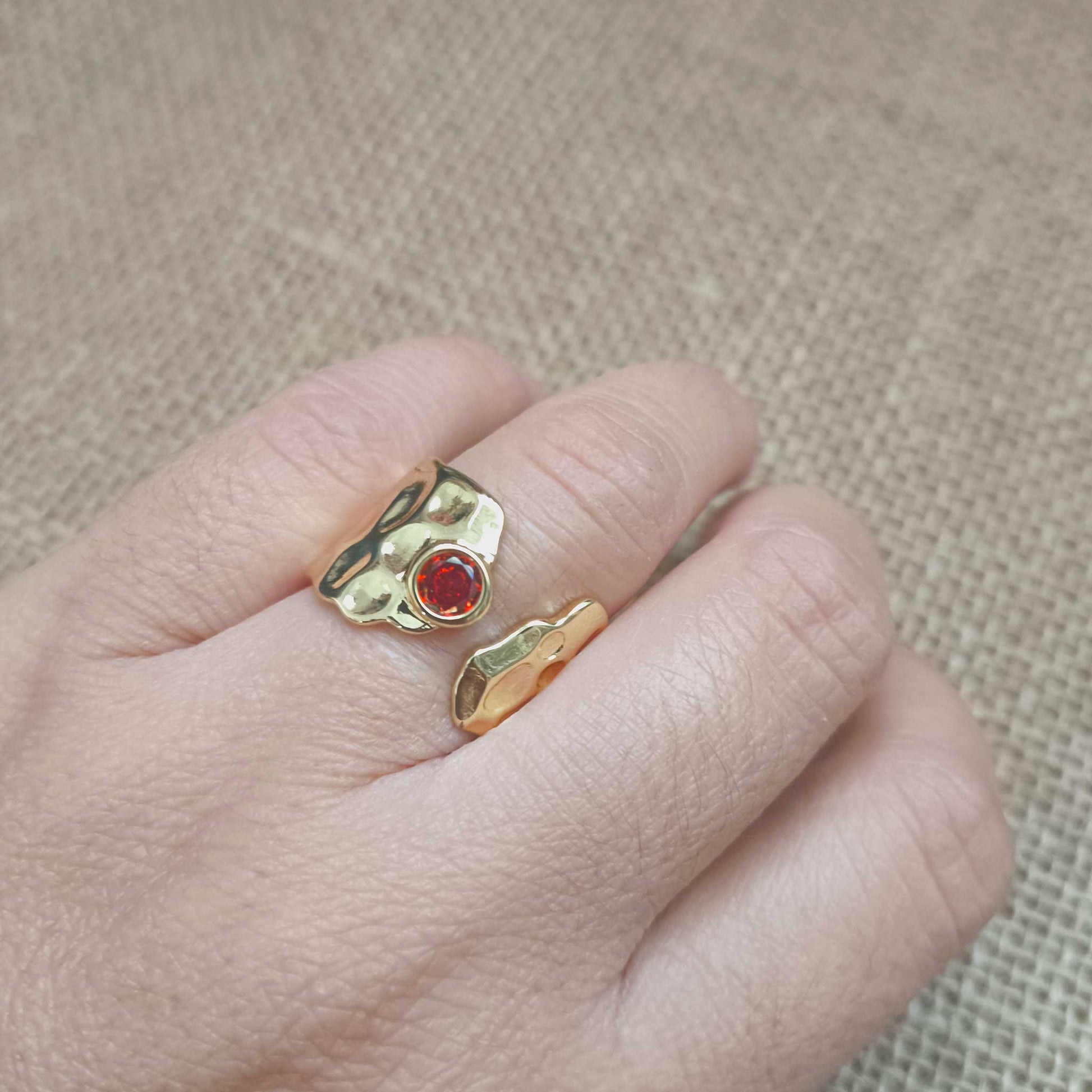 Anillo Ajustable Étnico Dorado con Circonita Roja - Fuego y Prosperidad