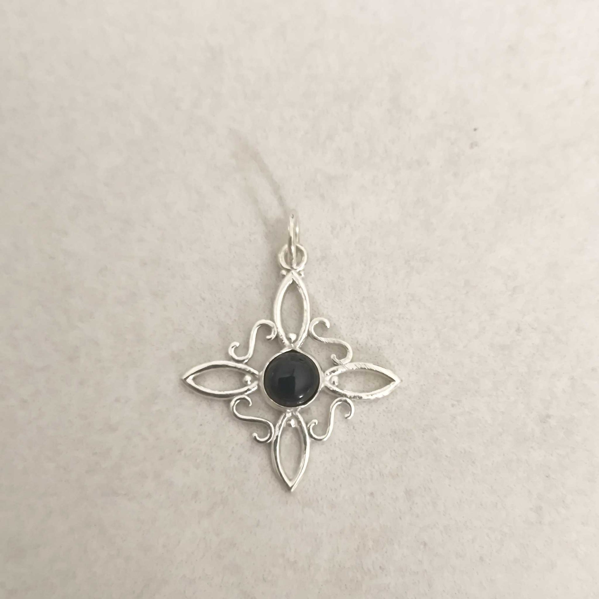 Colgante Nudo de Bruja en Plata de Ley 925 con Ónix Natural. Este delicado colgante combina la ancestral simbología del nudo de bruja con la poderosa energía del ónix natural. Elaborado en plata de ley 925, presenta un ónix pulido de 6.3 mm en su centro, mientras sus dimensiones de 31.5 x 27.8 mm lo hacen perfecto para llevar cerca del corazón.
