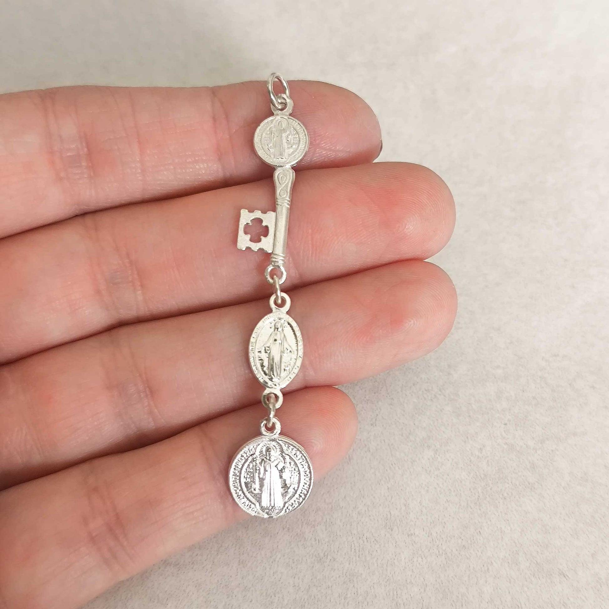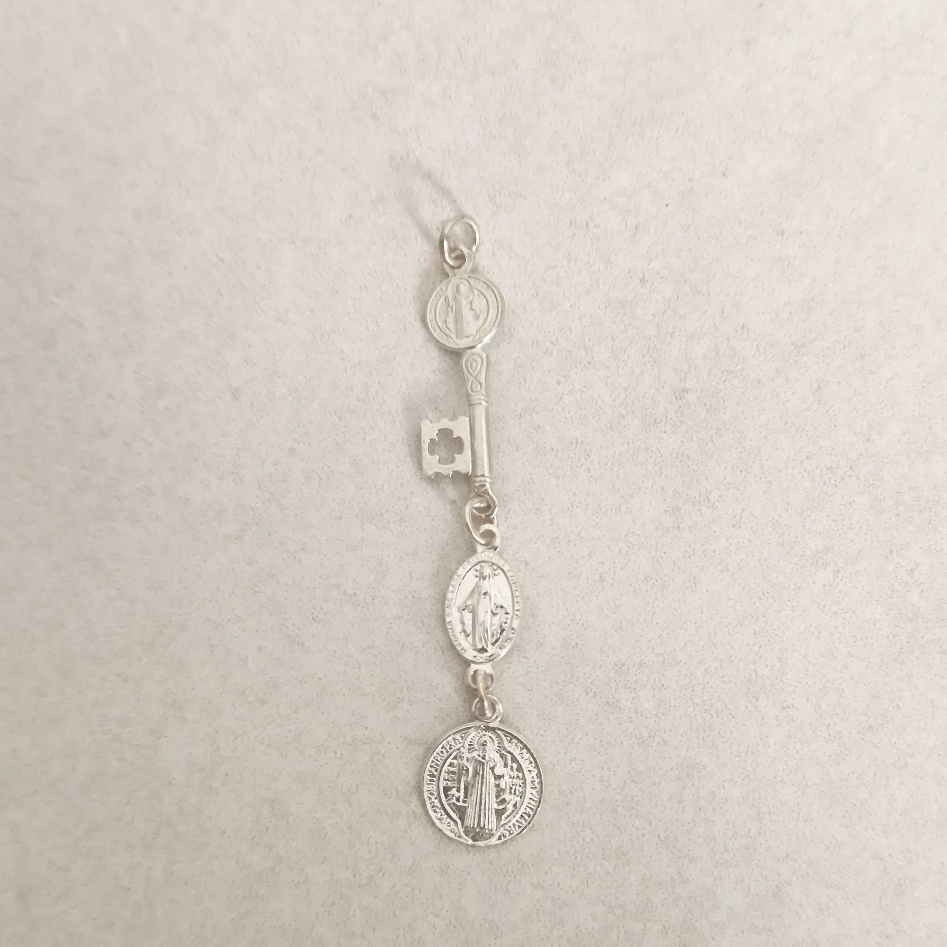 Colgante Triple Protección en Plata 925 - Llave San Benito, Medalla Milagrosa y San Judas Tadeo