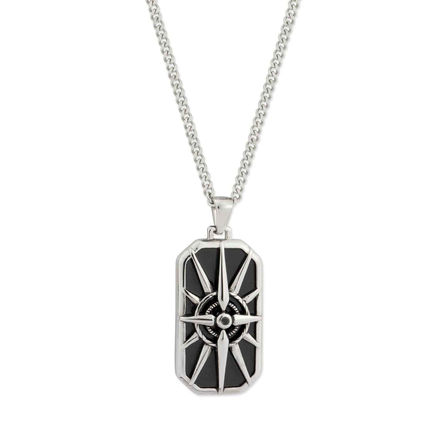 Collar Placa de Acero Inoxidable con Brújula y Baño de Rodio - Cadena Larga (67 + 7 cm)