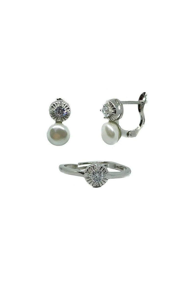 Conjunto fabricado en Plata de Ley 925, Rodiada. Conjunto formado por pendientes con cierre catalán y sortija ajustable, circonita blanca y perla. La perla mide 6.4 mm de diámetro, la circonita mide 2.96 mm de diámetro y está engarzada en motivo redondo que mide 6 mm de diámetro. Los pendientes en total miden 12.7 mm de alto por 6.4 mm en su parte más ancha. Y el anillo tiene circonita blanca de 2.6 mm de diámetro engarzada en motivo redonde de 5.79 mm de diámetro. El grosor del aro del anillo es de 1.47 mm.