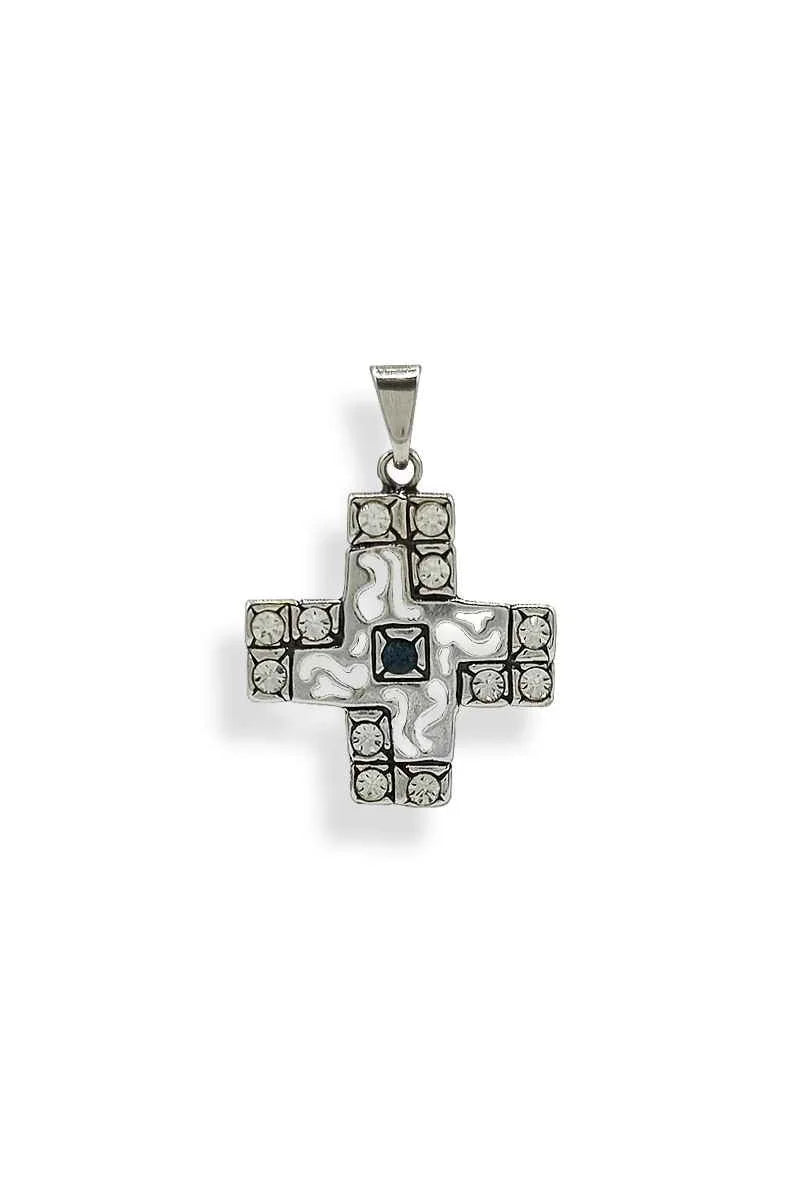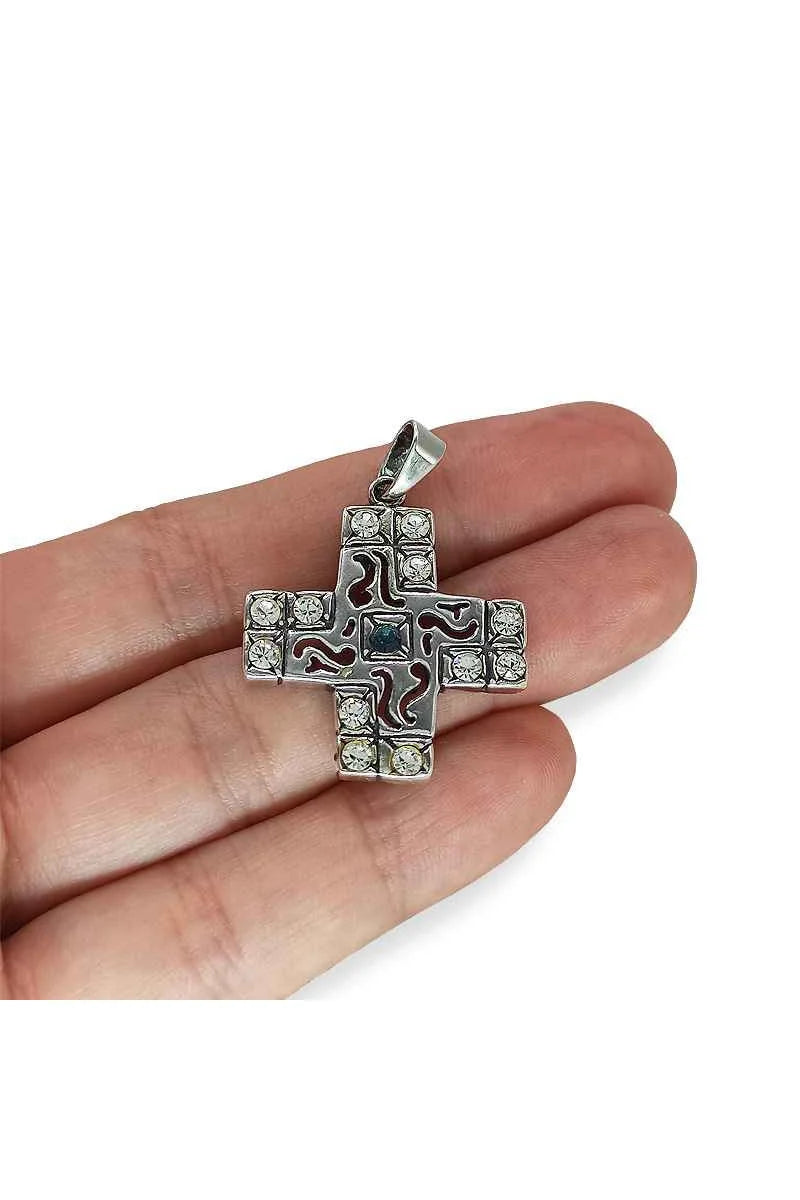 Cruz Cuadrada fabricada en Plata de Ley 925, con circonitas blancas y una azul en el centro. Mide 24.5 x 24.5 mm. Con la anilla incluida mide 33.5 x 24.5 mm.
