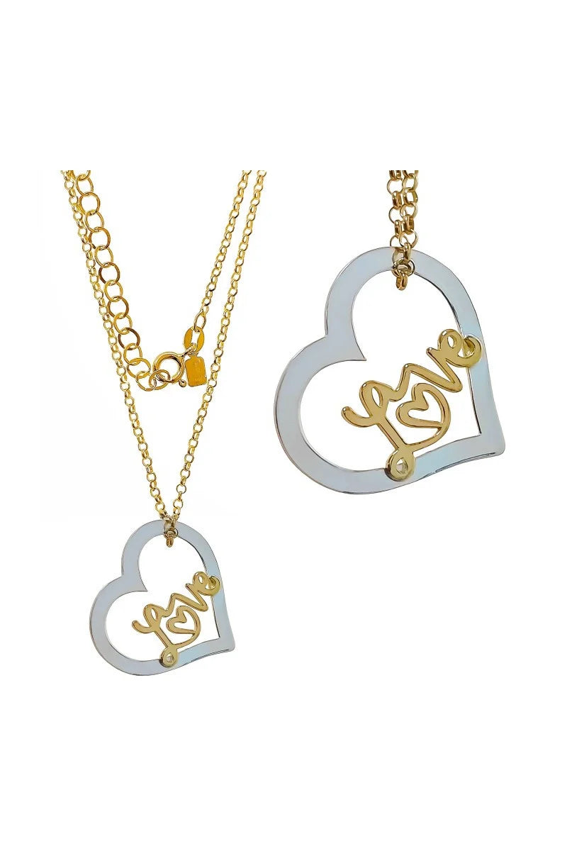 💎 Gargantilla de plata de ley 925 chapada en oro bicolor. 🔗 Cadena rolo diamantada chapada de 40 cm de largo + cadena adaptable de 5 cm. ❤️ Motivo de corazón bicolor de 25mm x 23mm con la palabra "love" en su interior. 💖 El corazón con la palabra "love" simboliza el amor eterno y la conexión profunda. 🎁 Se entrega con elegante cajita y bolsa, listo para regalar. 💍 Una joya es para siempre, elige la tuya en , Joyería online.