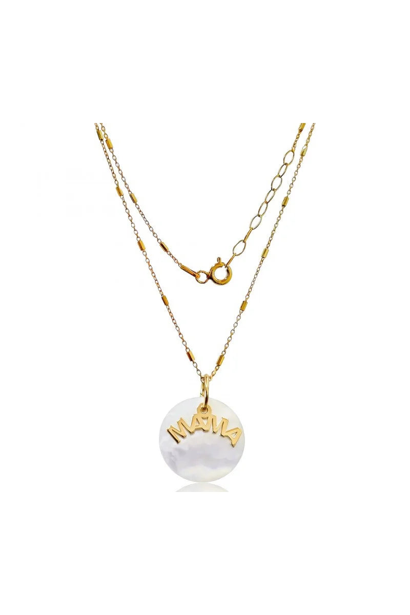 Gargantilla fabricada en Plata de Ley 925, chapada en Oro de 18 Kilates. Cadena combinada con barritas, que mide 42 cm largo + cadena adaptable de 3 cm. El colgante es de nácar redondo de 16 mm y tiene el mensaje "Mamá ".