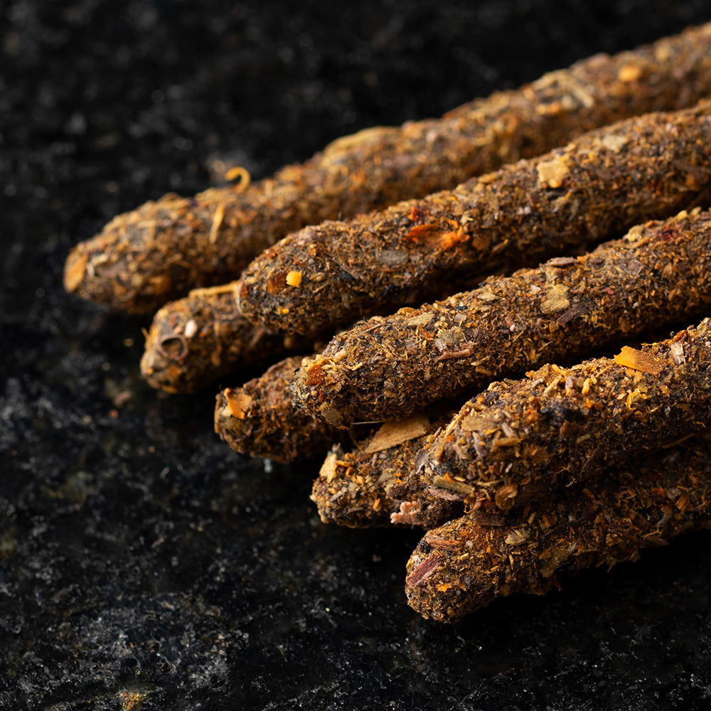 - Composición: Elaborado con una mezcla natural de hierbas, resinas, cedro, carbón vegetal, biomasa de frutas, aglutinante natural y sal.