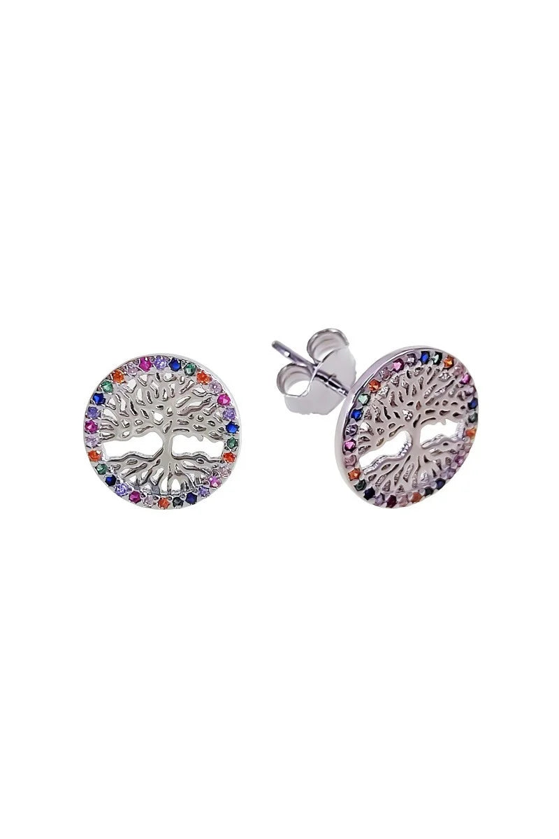 Pendientes fabricados en Plata de ley 925 rodiada con un diseño de árbol de la vida. Tienen un tamaño de 11 mm y están decorados con piedras microengastadas, lo que les da un toque de brillo y elegancia. Además, cuentan con un práctico cierre de presión para mayor comodidad.