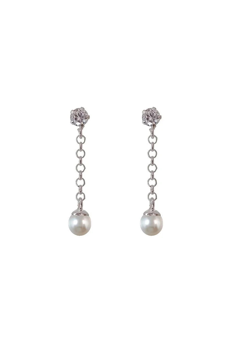 Pendientes fabricados en Plata de Ley 925. Pendientes con cadena de rolo de 13 mm largo y 2 mm ancho, con circonita blanca con garra de 4 mm y perla blanca de 5 mm. Los Pendientes miden en total 26 mm largo y tienen cierre de presión.
