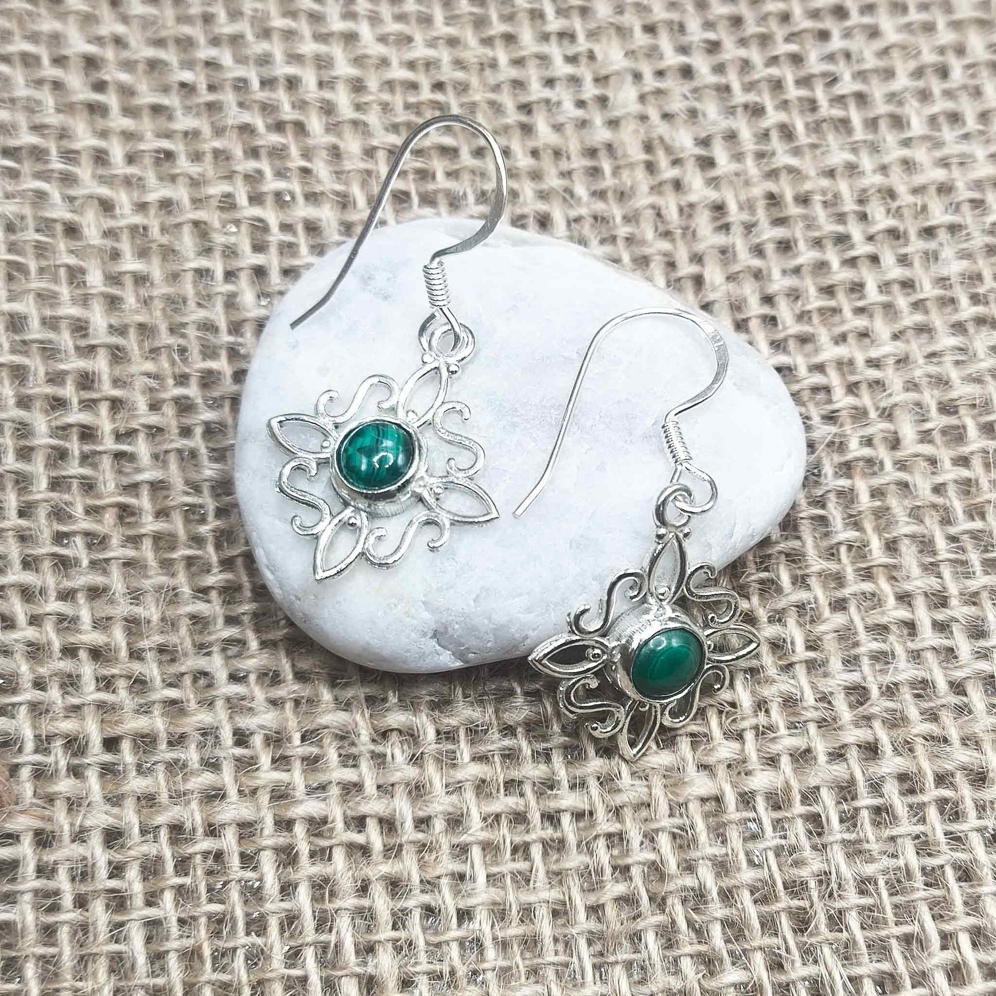 Fabricados en auténtica Plata de Ley 925, cada pendiente presenta el Nudo de Bruja (21.3 x 18.5 mm), el talismán celta que anula las malas energías. En su centro, llevan engarzada la Malaquita (7 mm), conocida como la "piedra del cambio", que absorbe las poluciones energéticas, ofrece protección activa y facilita la evolución espiritual. El práctico cierre hippie asegura comodidad y estilo.