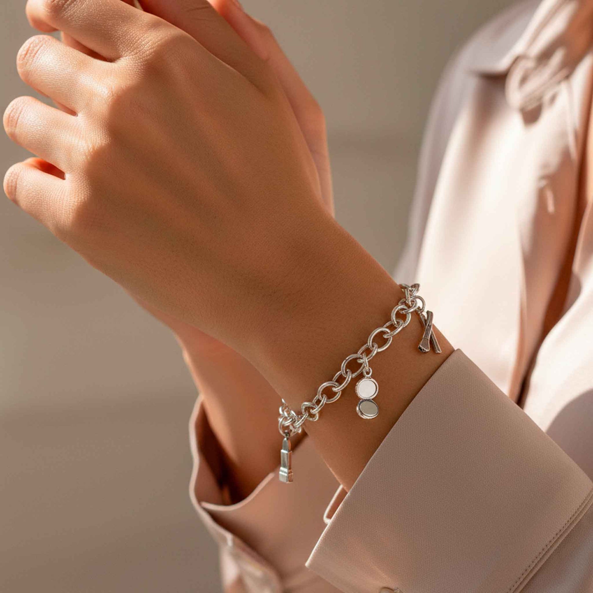 Despierta la magia en tu día a día con esta pulsera de Plata de Ley 925, una joya que rinde homenaje a la esteticista y al arte de transformar. Con 19 cm de longitud, cada uno de sus cinco dijes encierra un secreto de belleza: